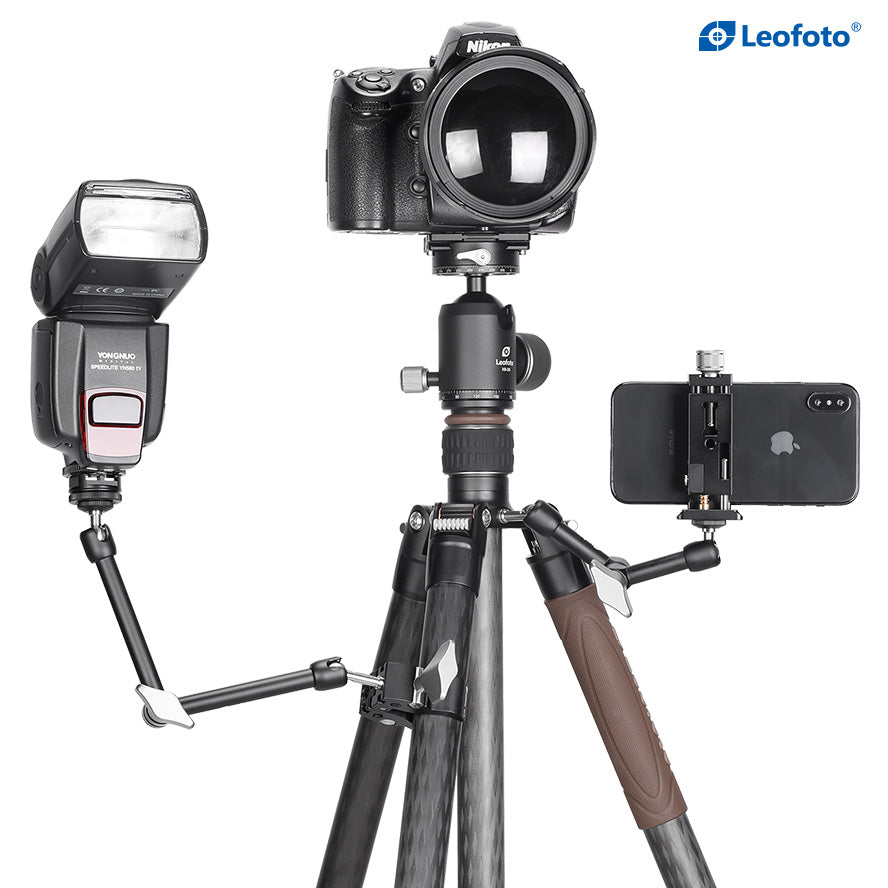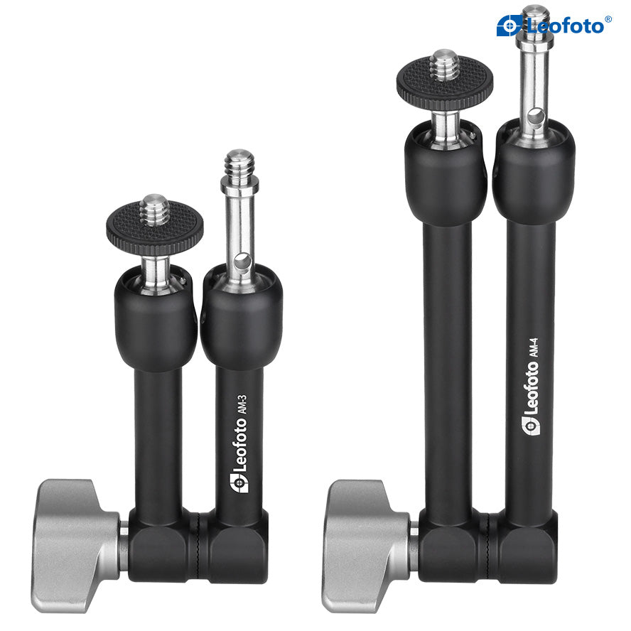The Leofoto AM Series Versa Magic Arm is a multi-purpose tripod accessory that attaches to the leg of select Leofoto tripods, or other tripods and camera brackets with a 1/4"-20 accessory slot. The magic-arm allows a light, microphone, monitor, smartphone, tablet, or even an additional camera to be affixed to a camera rig without the added bulk of a clamp. Each end of the magic arm features a ball-and-socket joint that rotates 360°, and the center elbow joint locks in any position. The large, easy-to-grip center knob locks all three movements simultaneously for quick and easy setup and repositioning.