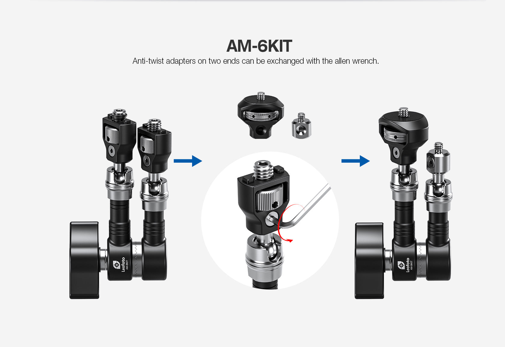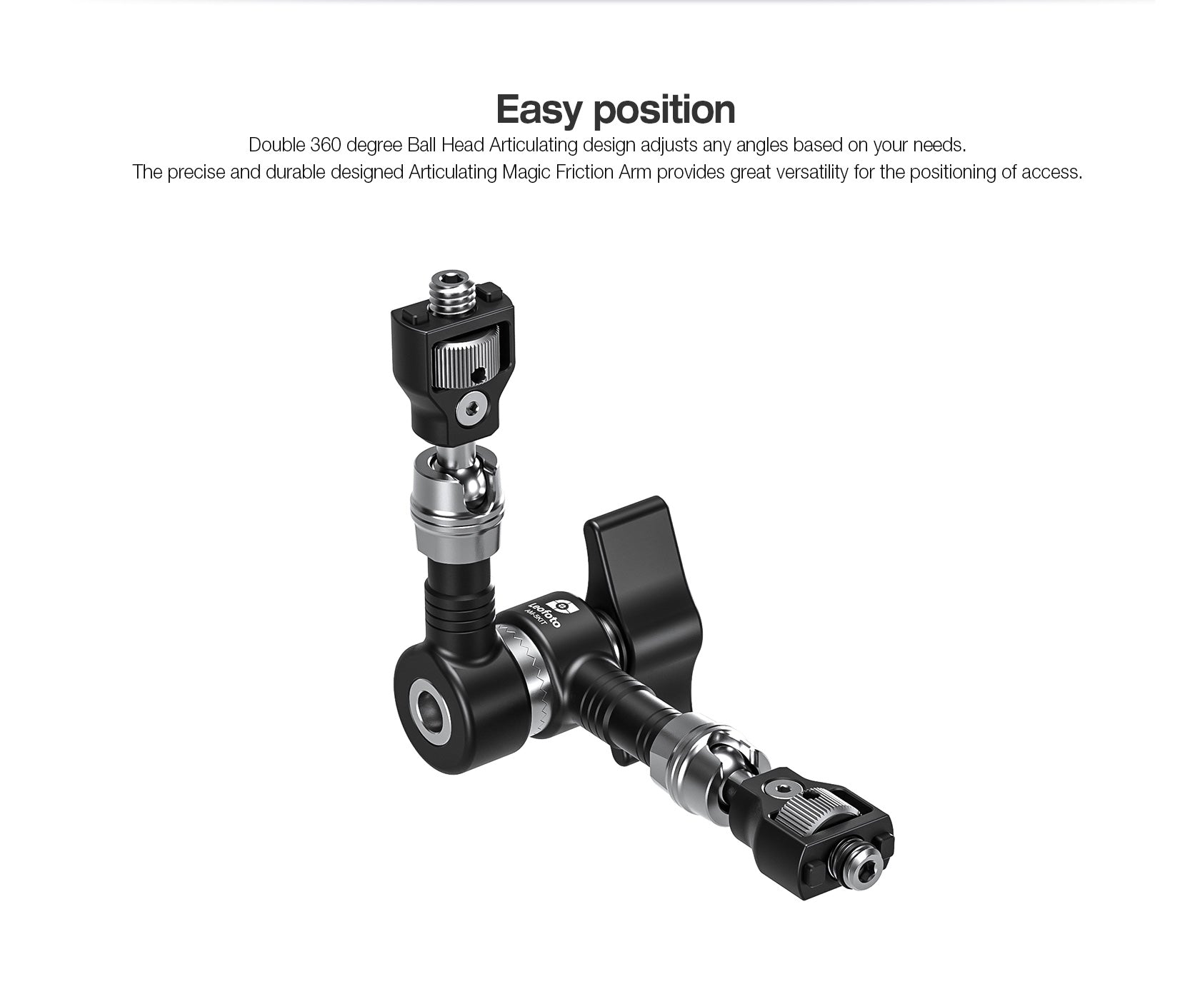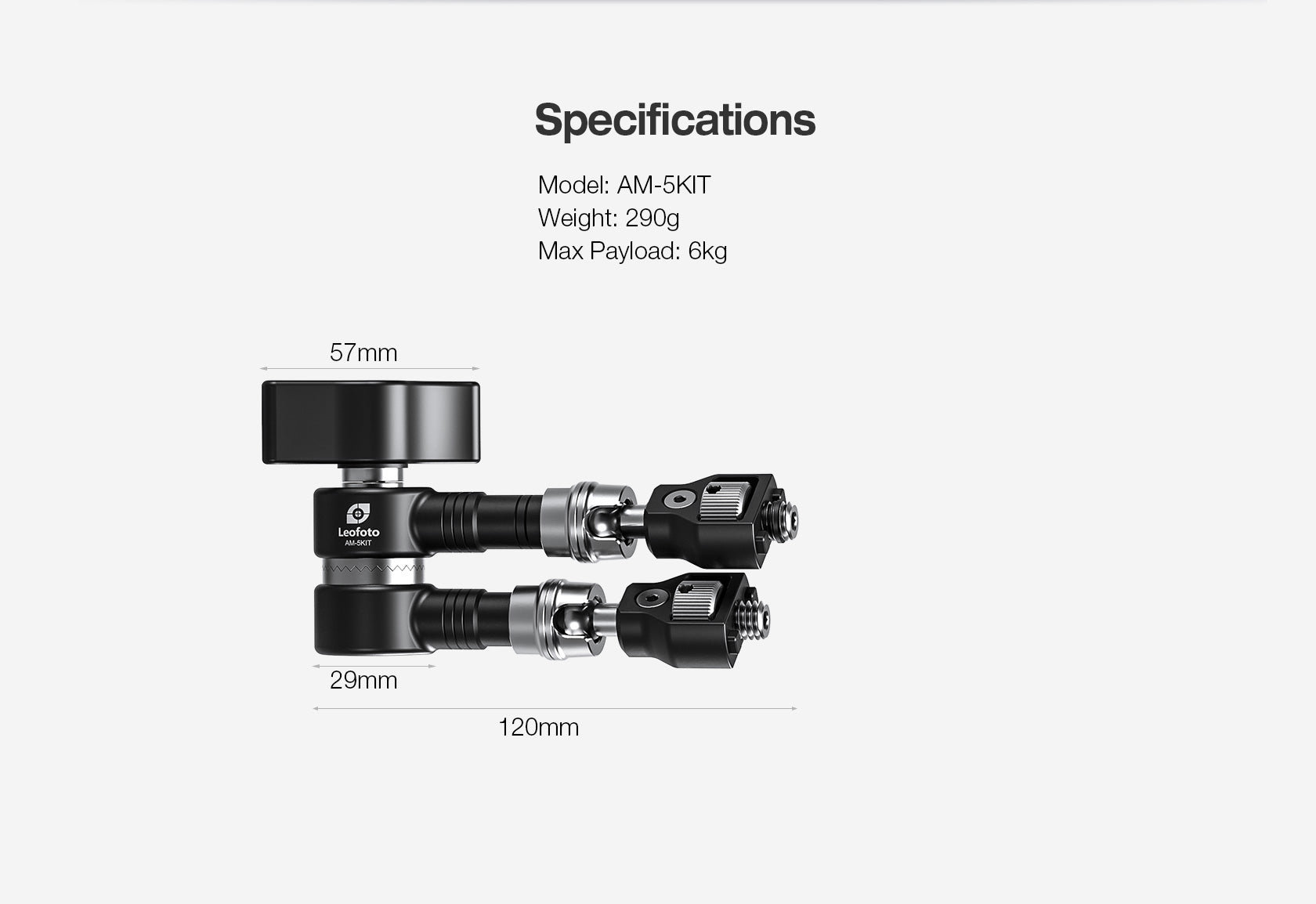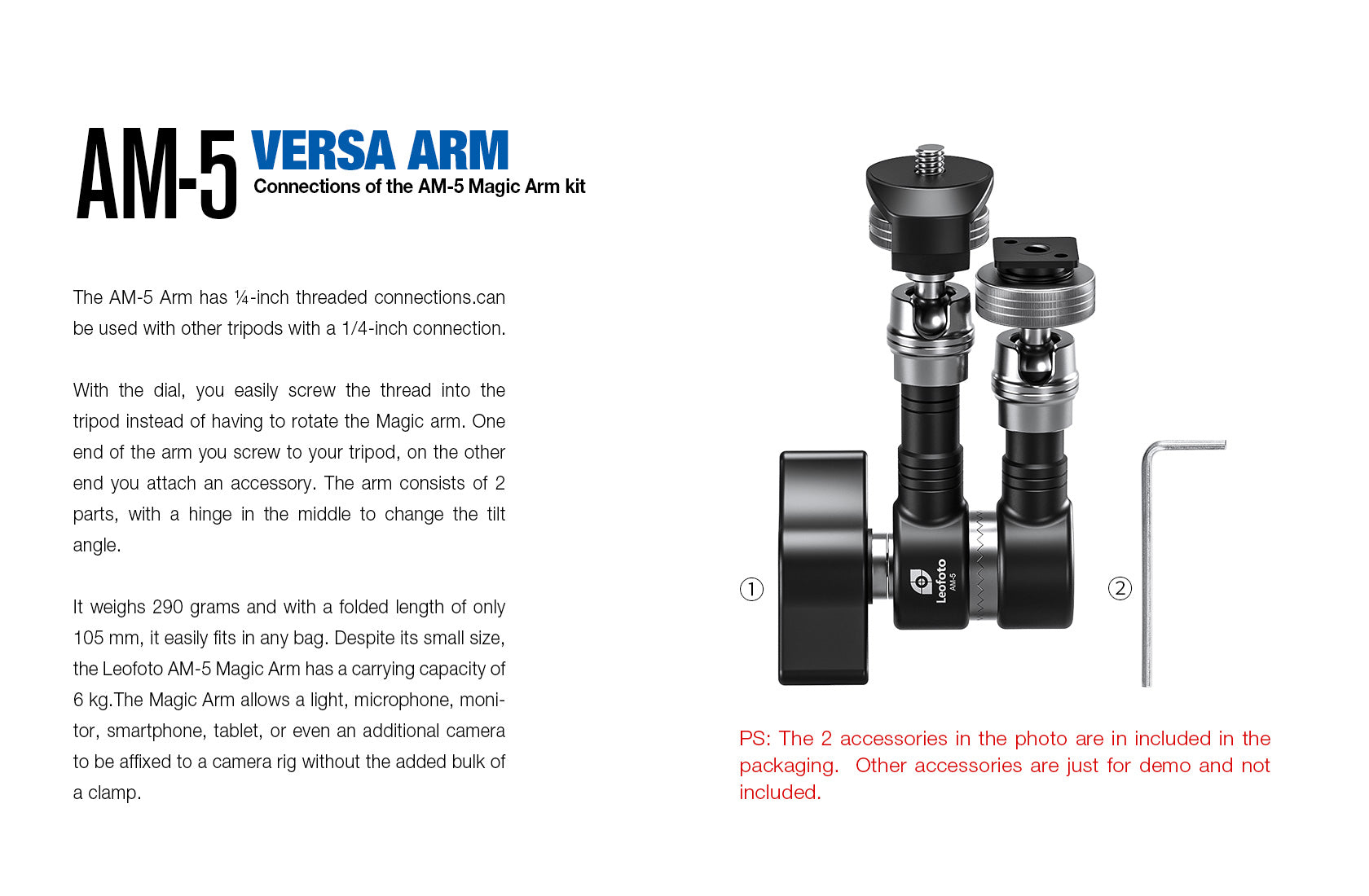 With the dial, you easily screw the thread into the tripod instead of having to rotate the Magic arm. One end of the arm you screw to your tripod, on the other end you attach an accessory. The arm consists of 2 parts, with a hinge in the middle to change the tilt angle.It weighs 290 grams and with a folded length of only 120 mm, it easily fits in any bag. Despite its small size, the Leofoto AM-5KIT Magic Arm has a carrying capacity of 6 kg. The Magic Arm allows a light, microphone, monitor, smartphone, tablet, or even an additional camera to be affixed to a camera rig without the added bulk of a clamp.