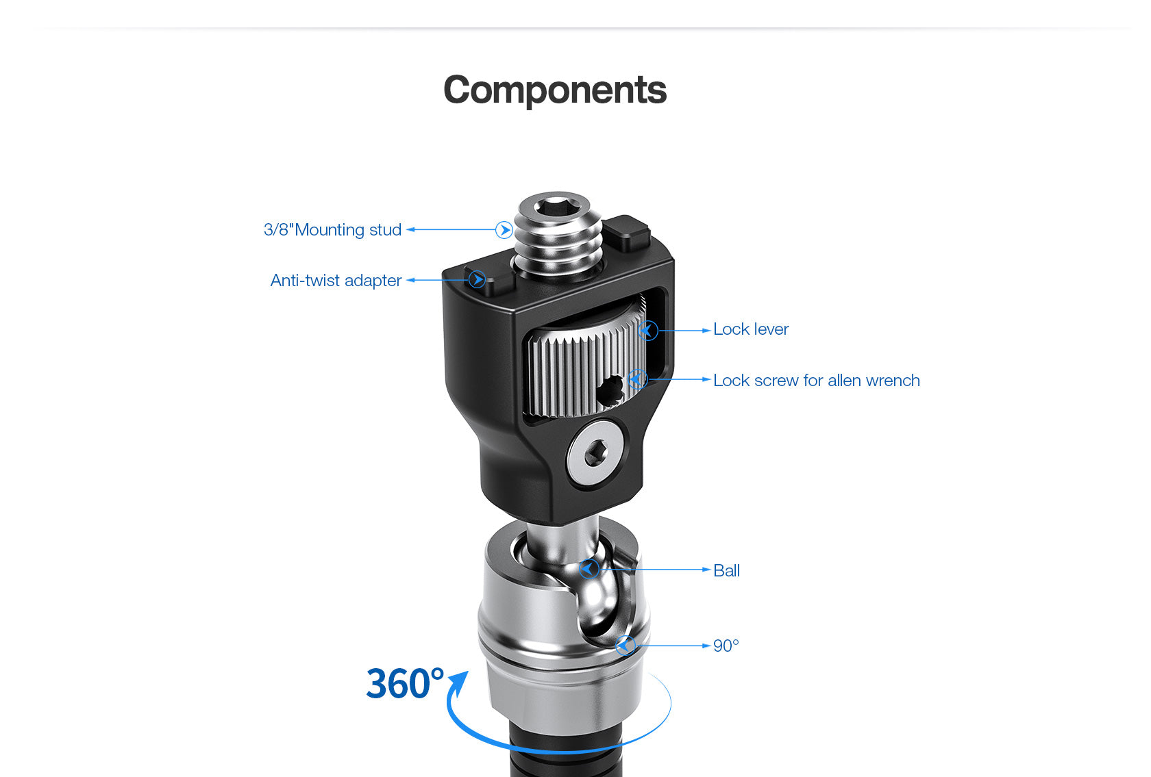 The AM-5KIT Arm has 1/4-inch threaded connections. The AM-5KIT Arm kit has a ball head with a 3/8-inch thread on both ends and also two adapters for a 1/4-inch thread included. This connection is meant for the tripods of the Leofoto Summit. MAMBA(LVM) series but can also be used with other tripods with a 3/8-inch connection.