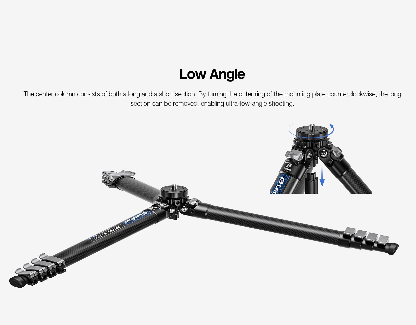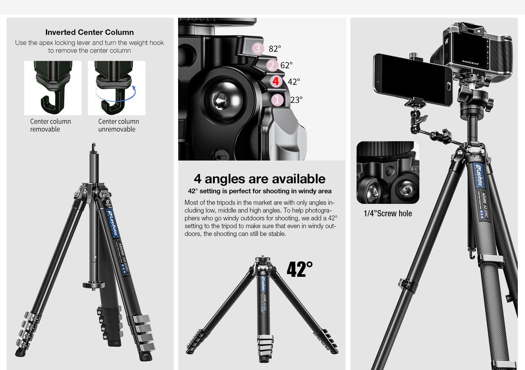 - Four leg angle settings: For flat camera positions, slopes or creative angles.