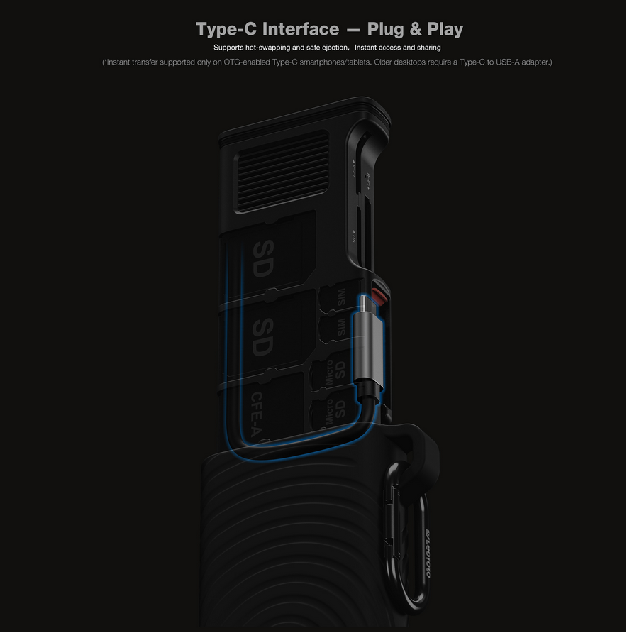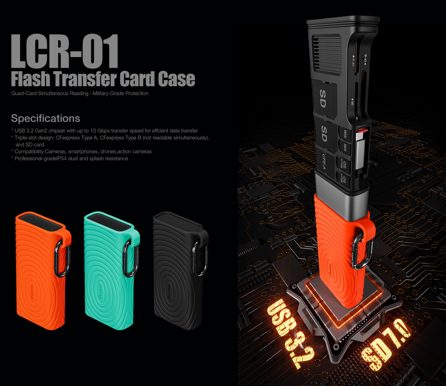 The LCR-01 is a professional-grade card reader and protective storage solution designed for fast data access and secure card management. Supporting multiple high-speed card formats and built with rugged, travel-ready protection, it is ideal for photographers, videographers, and mobile professionals working in demanding environments.