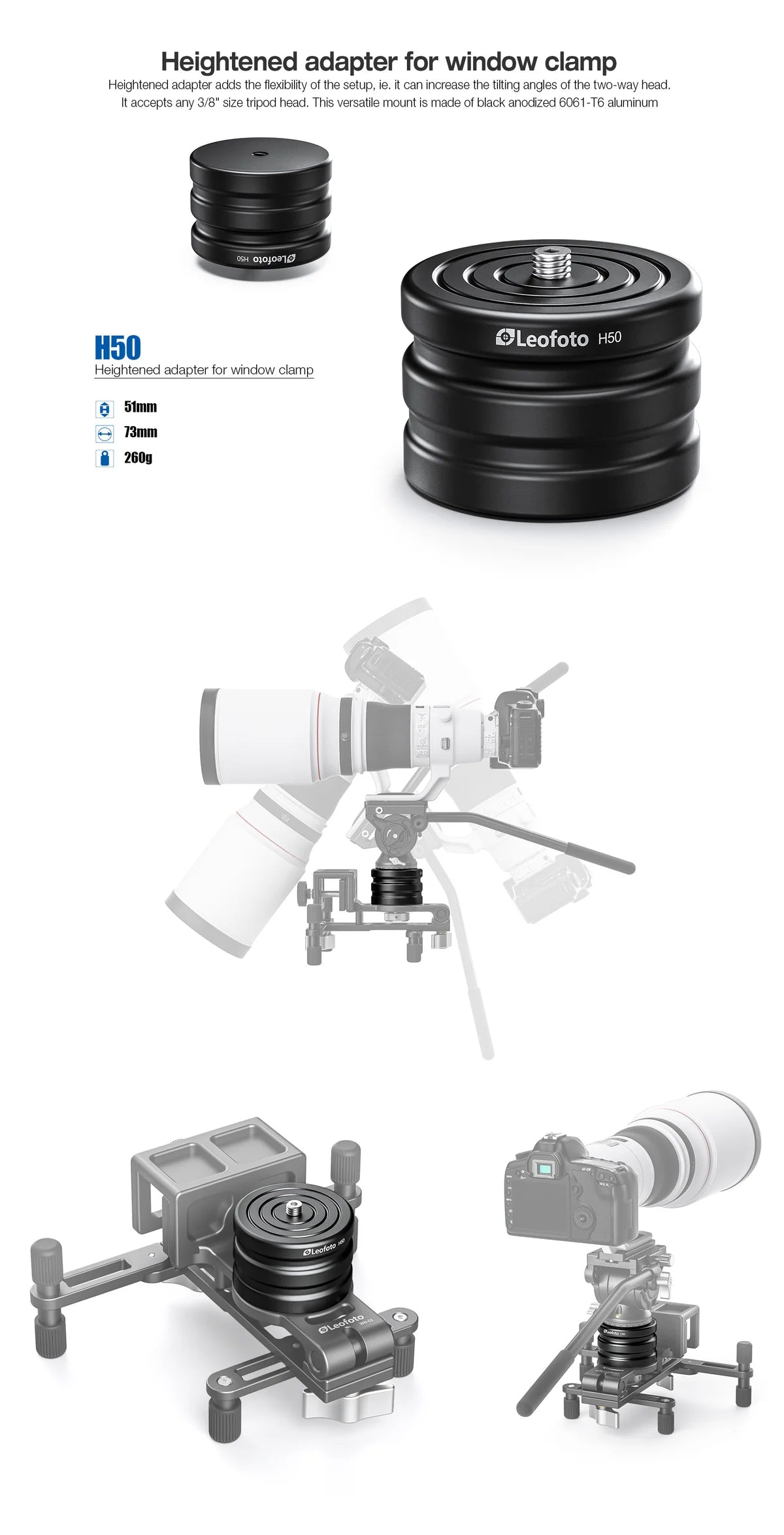 The H50 is a 51mm tall adapter that accepts 3/8th mounting. There is a 3/8th stud on top and a 3/8th mounting socket on the bottom. It's made of black anodized 6061-T6 aluminum.