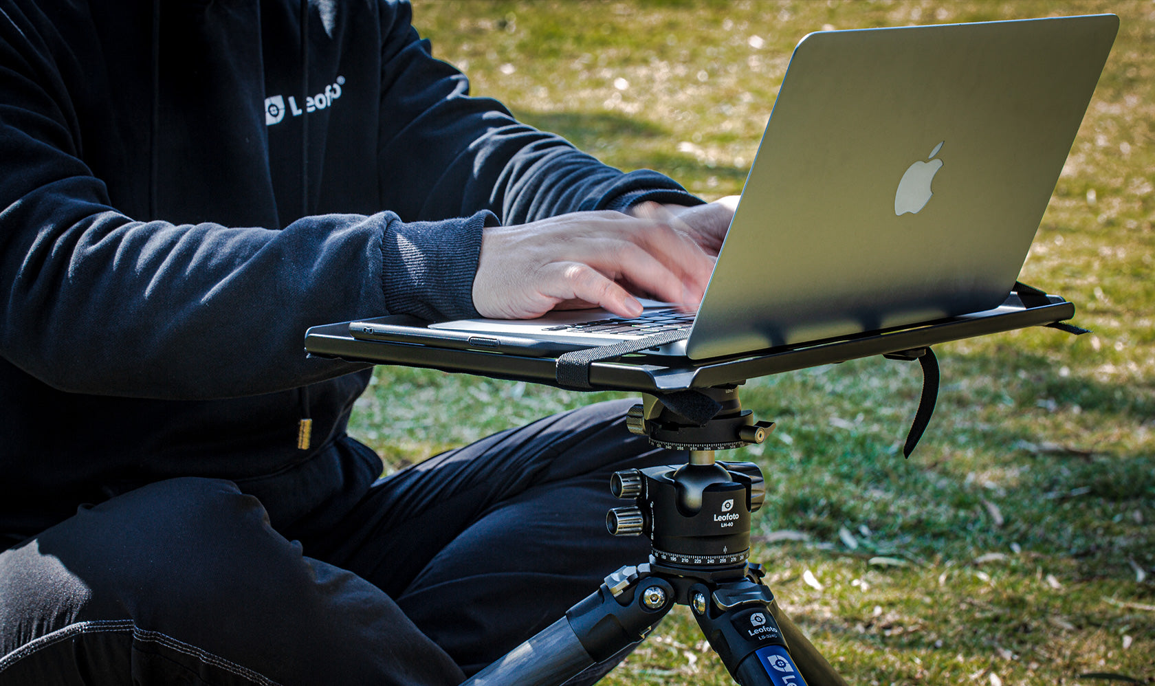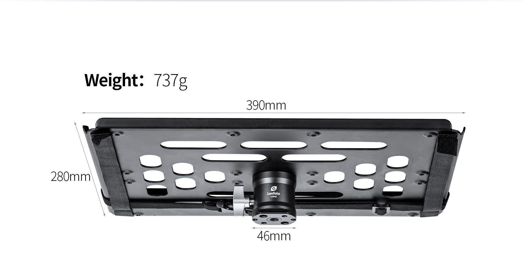 With the LCH-2 laptop platform mounted on a tripod you have a solid platform to place a 15" laptop on. The raised edges ensure that the laptop cannot slide out of the holder. For extra security, the LCH-2 has an additional elastic band that can be used to keep the laptop in place. The dimensions of the platform are 39cm by 28cm. The smart cutouts in the design of the tray have a dual function. The cutouts reduce the weight of the tray to 737 grams and they also serve as ventilation holes to dissipate heat from the laptop.