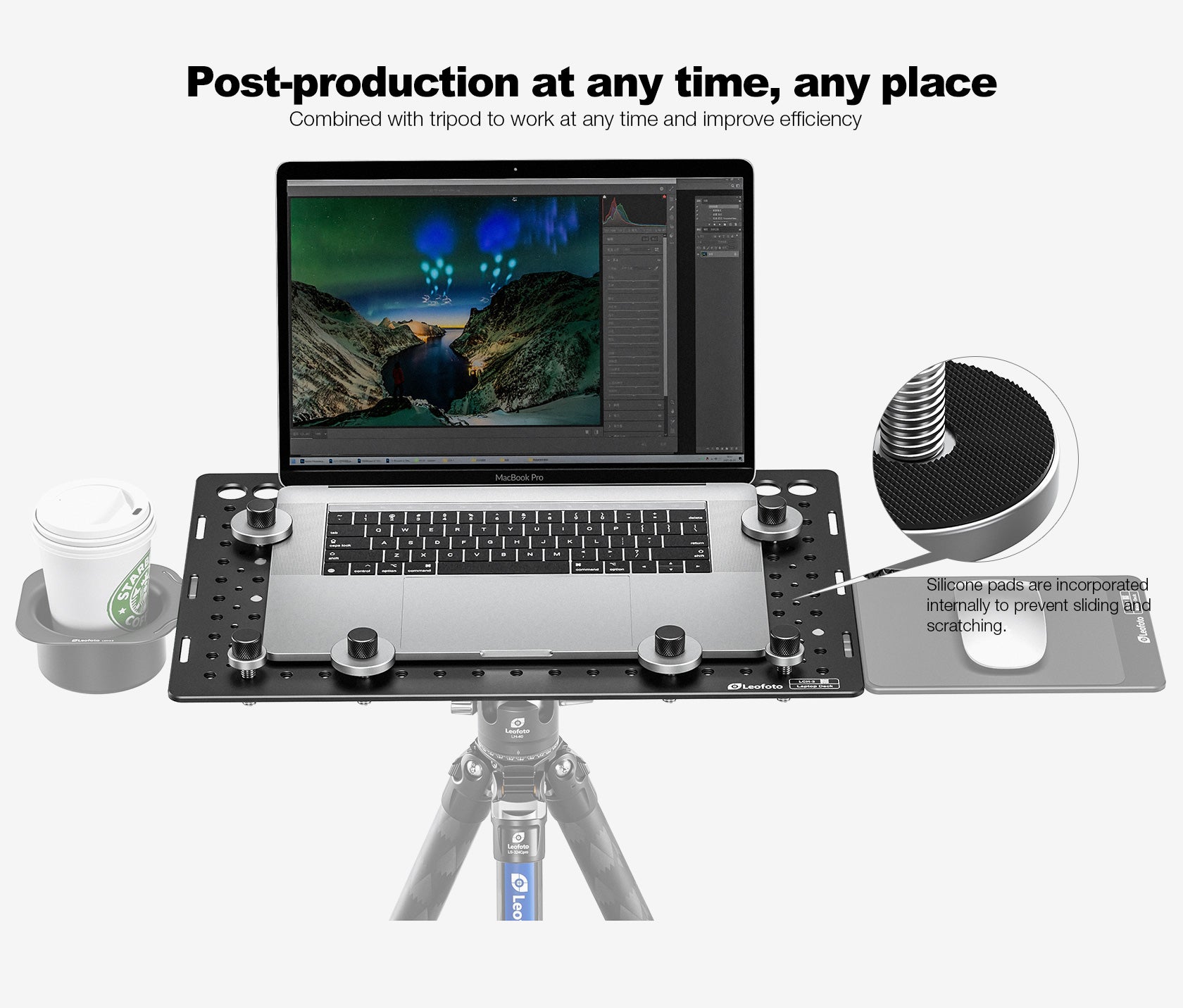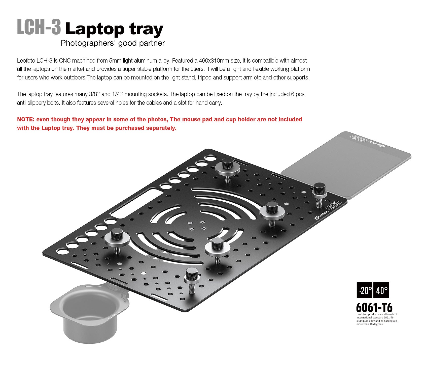 The LCH-3 is CNC machined from 5mm light aluminium alloy. Compatible with most laptops in the market and provides a stable platform for photographers on the move and working outdoors. The laptop tray features many 3/8"and 1/4" mounting sockets. The laptop can be affixed on the tray with 6 anti-slip rubberized bolts. Also has many holes to reduce weight as well as provide cable management.