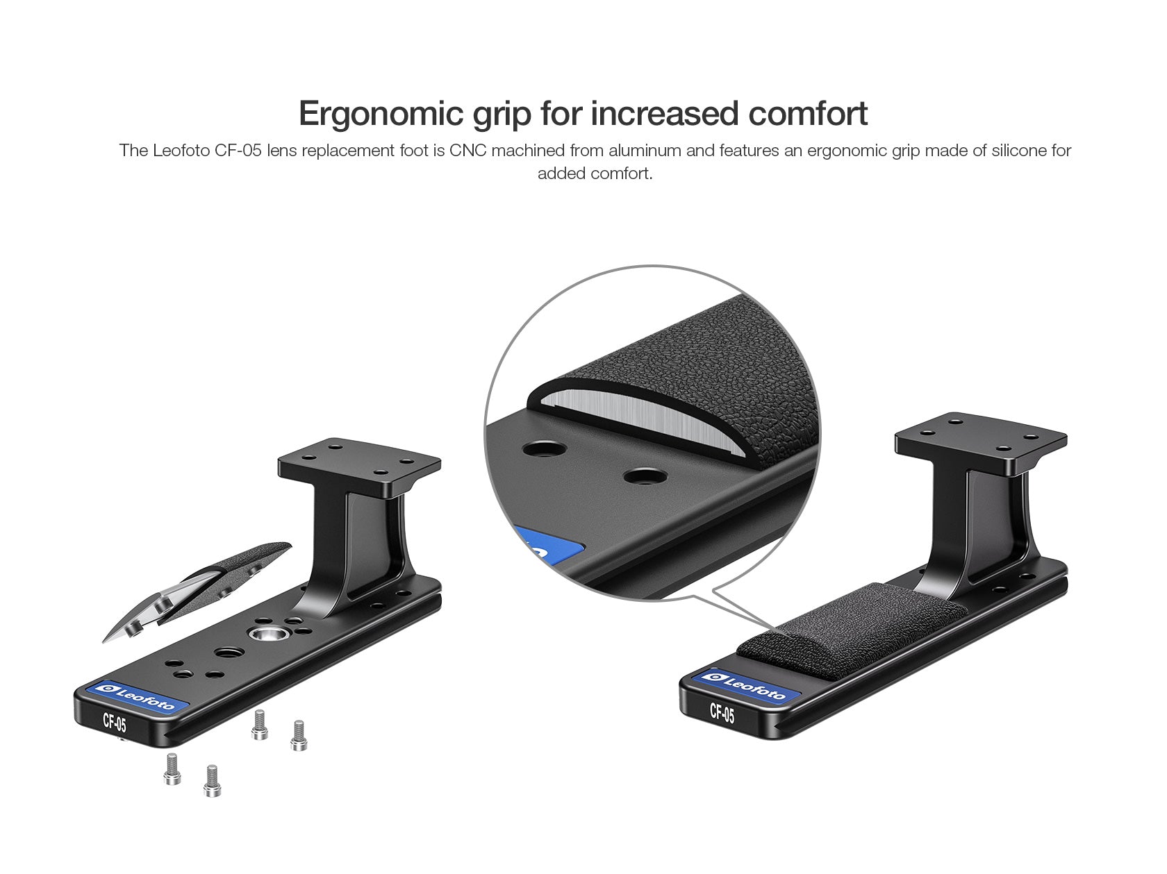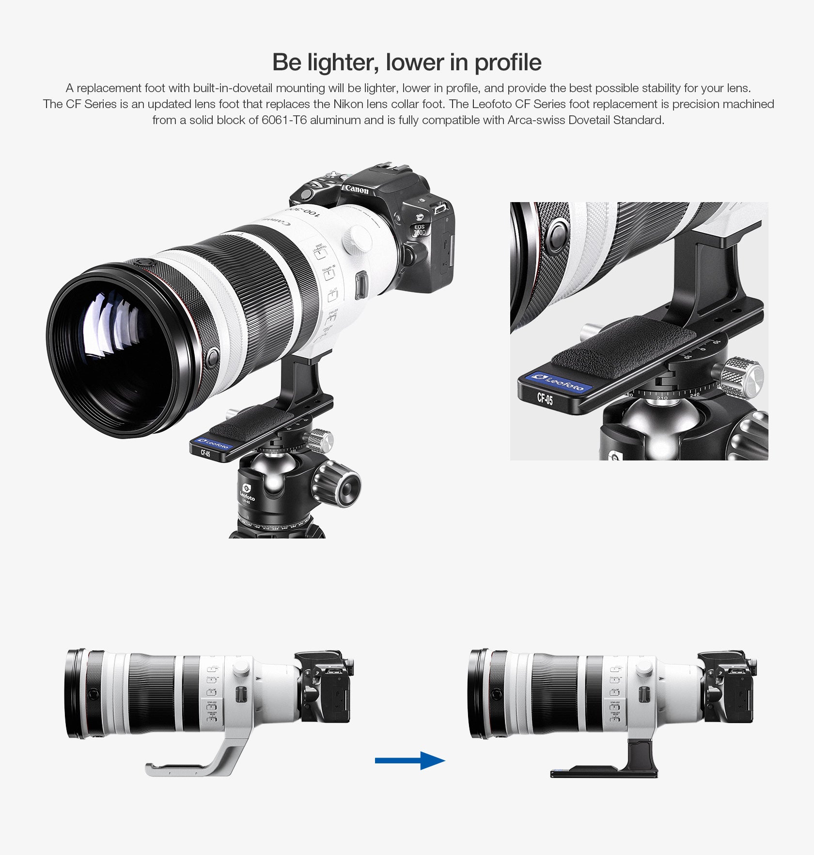 Leofoto Lens Foot CF-05 was designed to replace lens collar foot of the Canon telephoto mirrorless lens series RF 100-300mm F2.8L IS USM. Integrated with Arca Swiss dovetail, low profile, and lightweight precision-machined from single block T6061-T6 aluminium. It also was designed to be longer than most standard plates to allow easy usage for balancing on fluid heads/gimbal heads. Has 2 x M3 safety stops screws that can be removed if undesired. Has a ergonomic silicon grip for added comfort and grip.
