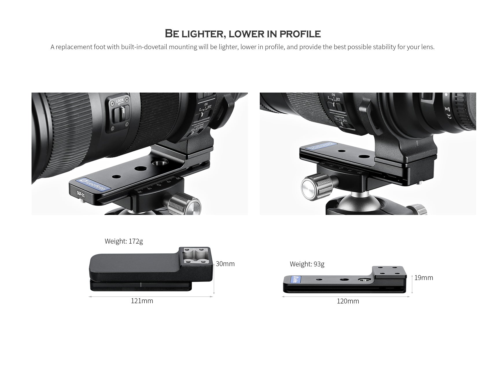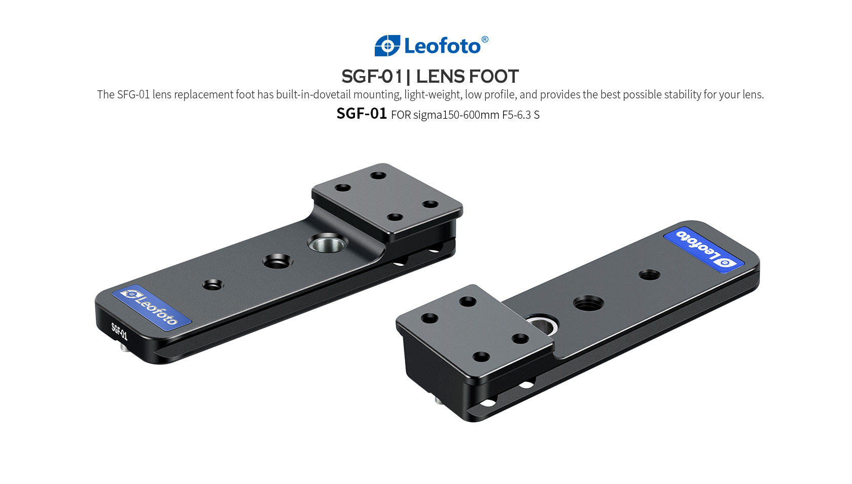 Leofoto Lens Foot SGF-01 was designed to replace lens collar foot of the Sigma telephoto mirrorless lens series. Integrated with Arca Swiss dovetail, low profile, and lightweight precision-machined from single block T6061-T6 aluminium. It also was designed to be longer than most standard plates to allow easy usage for balancing on fluid heads/gimbal heads