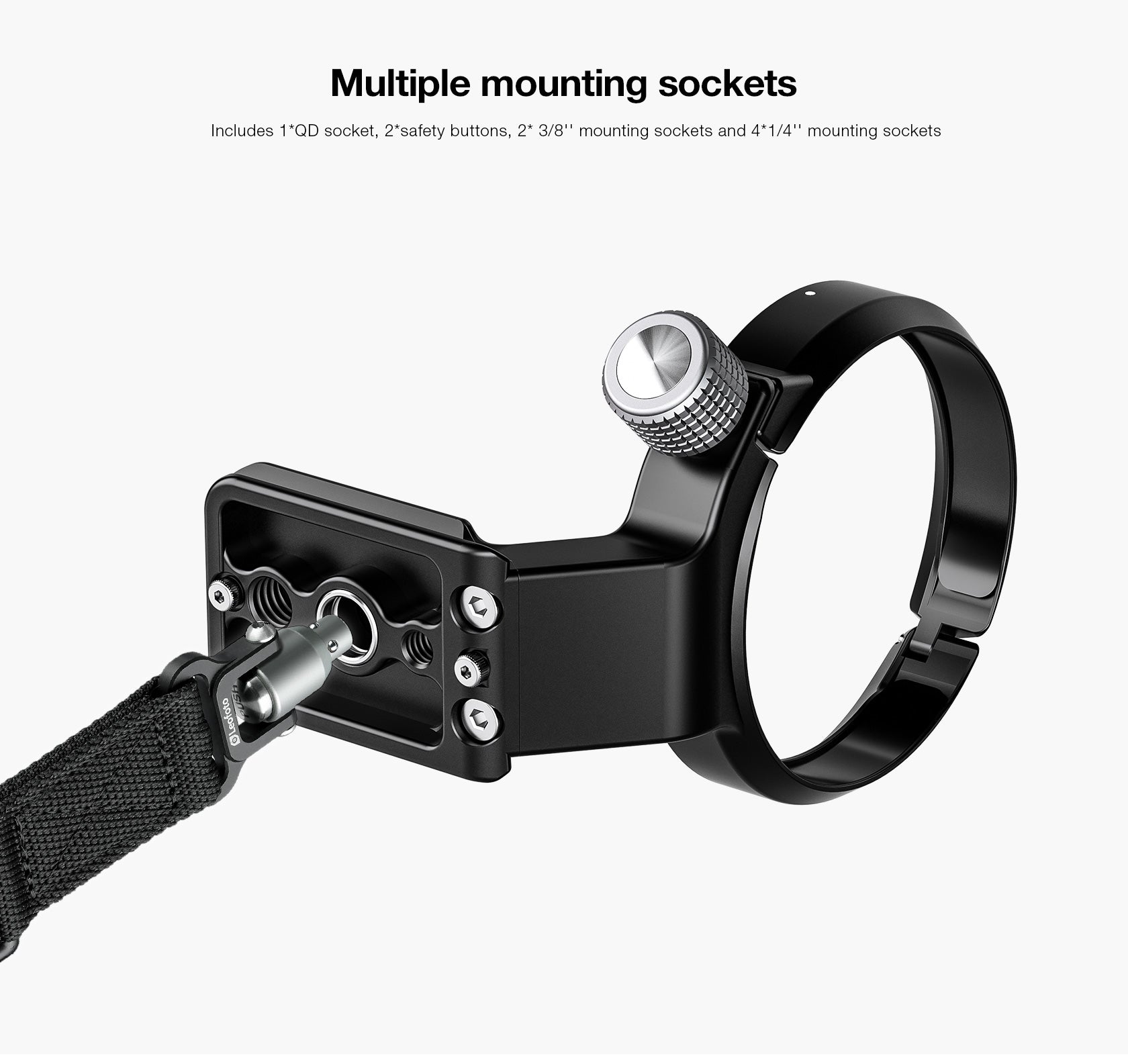 Equipped with an array of mounting sockets, the SFC-01 lens collar offers photographers versatile options for additional accessories. The collar includes a QD (Quick Detach) socket for fast strap attachment, as well as two 3/8″ and four 1/4″ mounting sockets. These options enable users to connect various accessories, like straps or additional supports, giving them the freedom to adapt their gear to different shooting requirements.