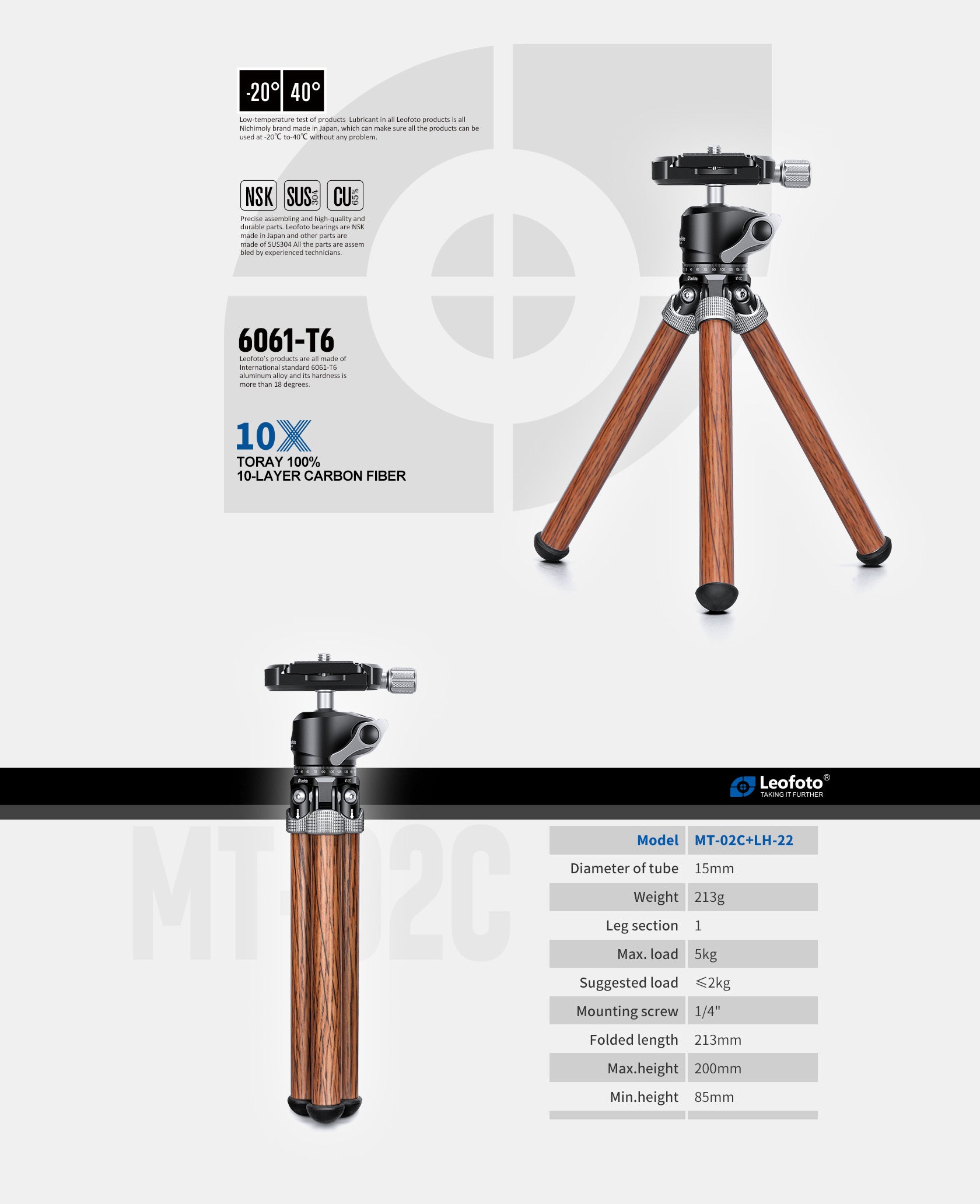 Leofoto Mini Tripod MT-02C (Wood Grain) carbon fibre tripod + LH-22 ballhead