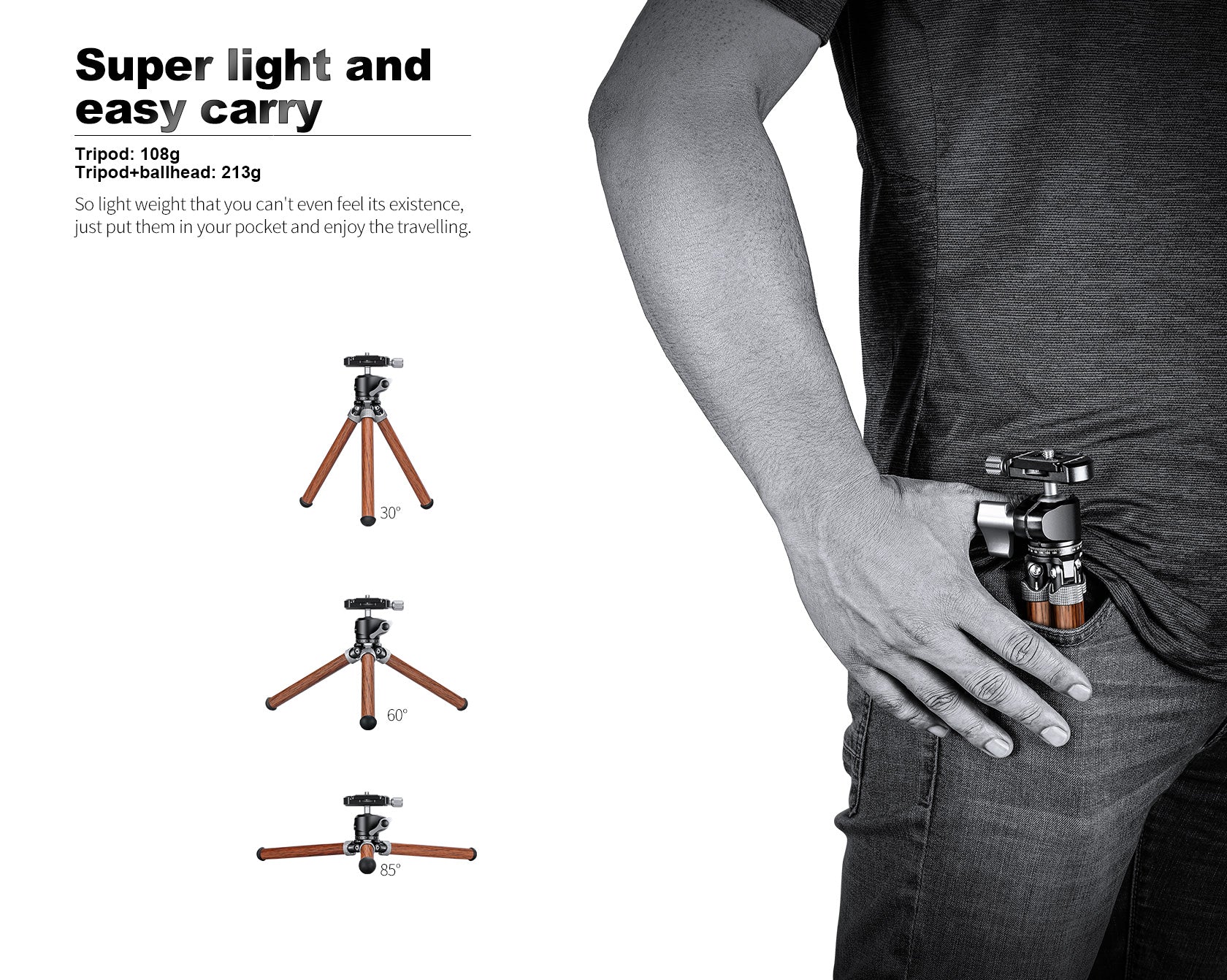 - Strong, stable and extremely lightweight Mini Tripod MT-02C (108g) with 3Kg maximum load capacity.