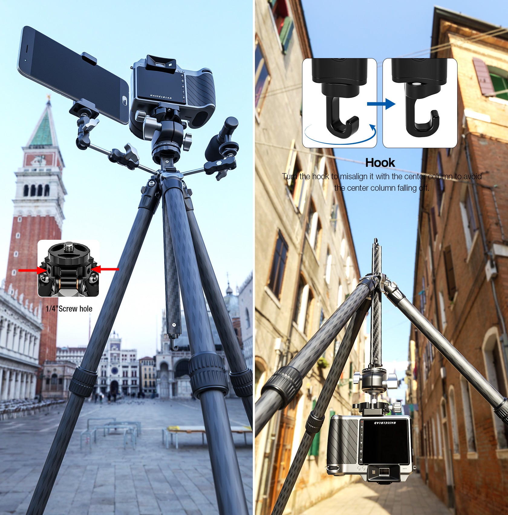 - Y shaped center column allows tripod legs to be closer together without sacrificing its stability and functions