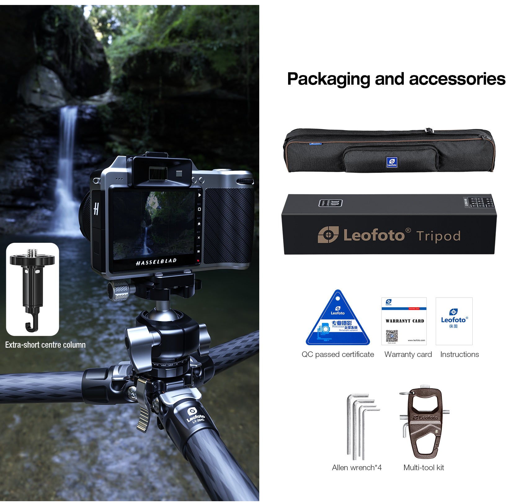 Tripod, Tripod Ballhead, Center Column, short column, Tripod Bag, Allen Tool & Multi-Tool.
