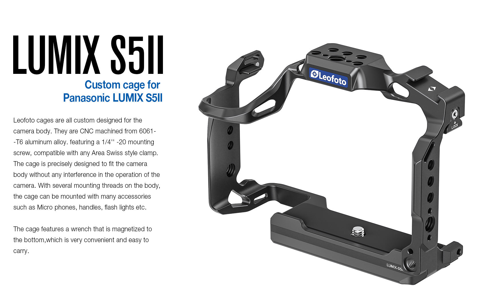 Protect your Panasonic Lumix S5 II Mirrorless Camera from the rigors of the production day while also providing multiple accessory mounting points that won't stress your camera's body with this form-fitting Leofoto LUMIX S5II Custom Cage for Panasonic Lumix S5 II Mirrorless Camera. The cage features one cold shoe mount on top of the cage and one on the side, as well as multiple 1/4"-20 and 3/8"-16 threaded accessory-mounting holes. The 3/8"-16 threaded holes feature anti-twist divots.
