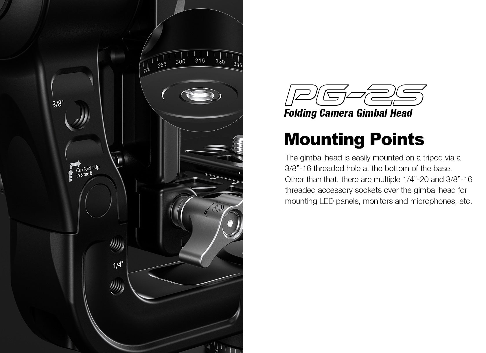 The camera platform, which is Arca-type compatible, has height adjustability to help balance a telephoto lens on the head. Along the arm of the gimbal are a 3/8" and two 1/4" accessory sockets. The design of the PG-2 allows for the gimbal to collapse for a more portable footprint, perfect for traveling when space is limited. The body has also been hollowed-out to optimize the weight to strength ratio. There is a certain stiffness designed with this model to enhance control and stability during use