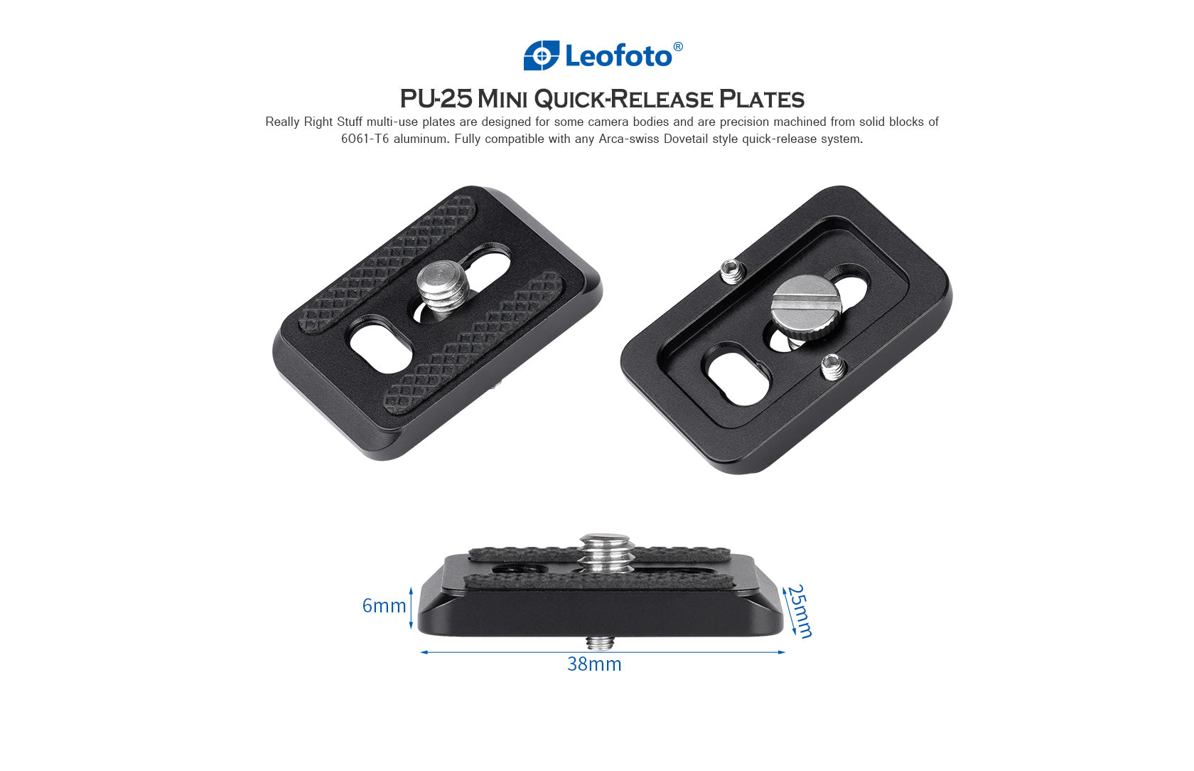 The Leofoto PU-25 arca swiss plate is made out of 6061-T6 aluminium. Small form factor suitable for small ballhead like Leofoto LH-25. Stopper screws can be removed if not required with allen key.