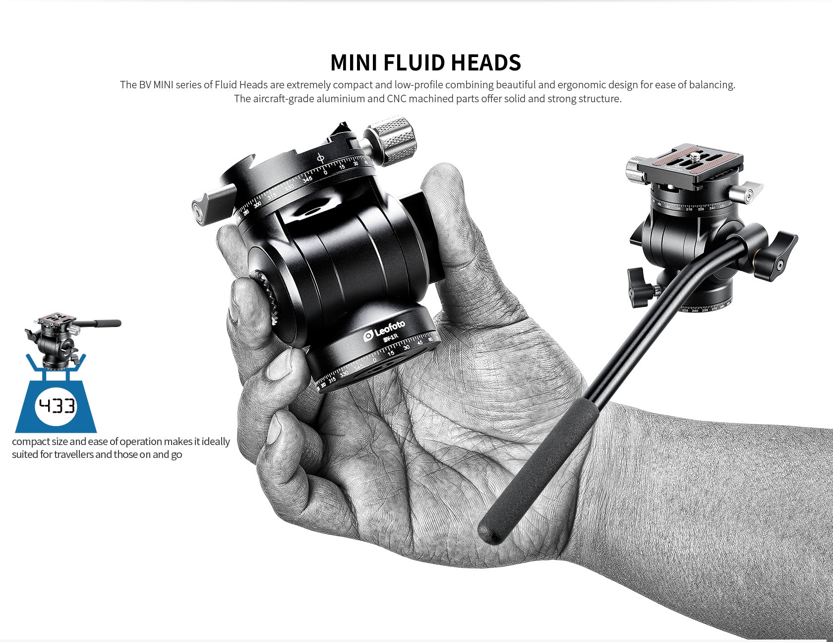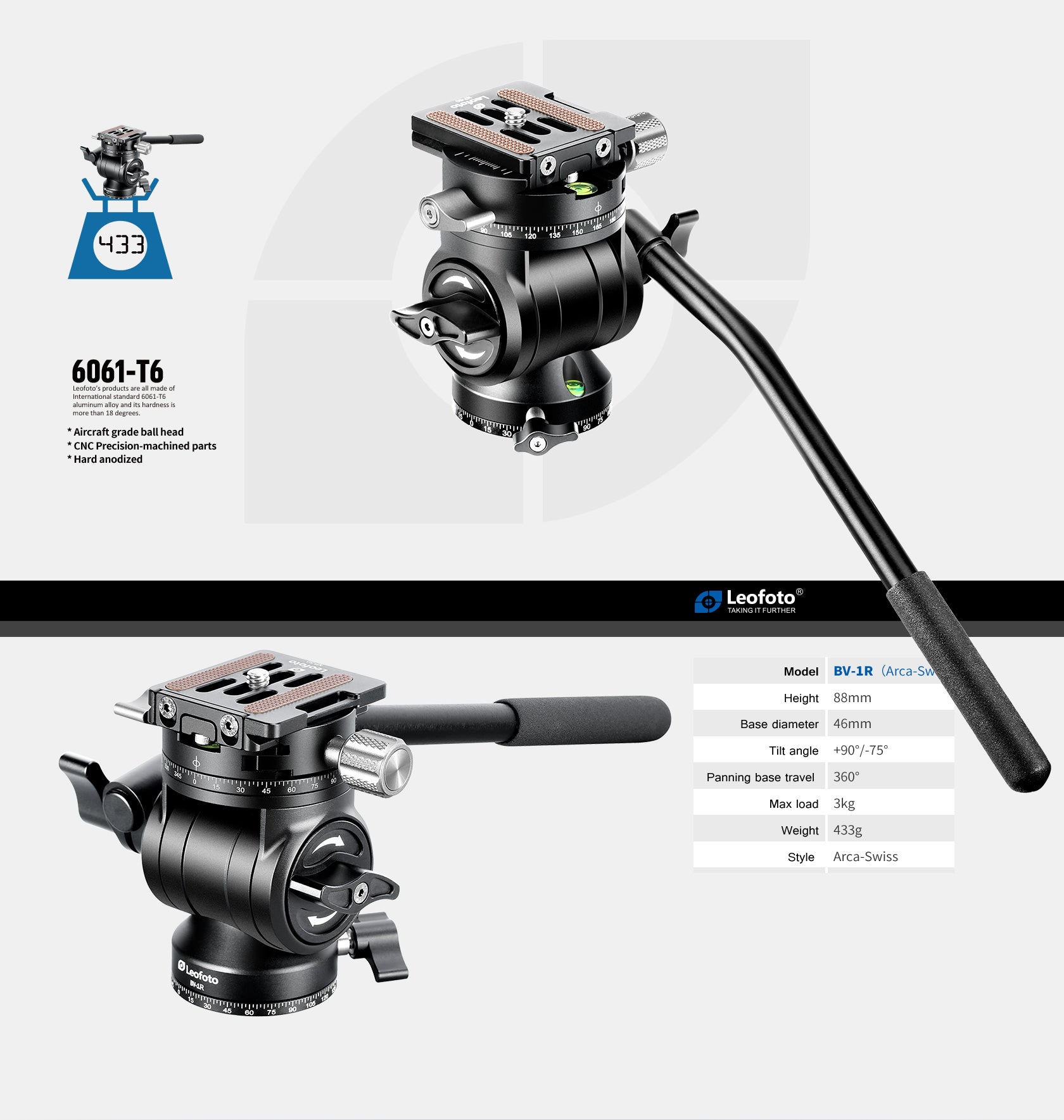 BV-1R Fluid Head with Panoramic Clamp and handle bar Max Load: 3kg Tilt Angle:+90/-75deg Base Dia: 46mm Height: 88mm Pan Cntrl: 360 degree Mount: UNC 3/8-16 QR Plate: Yes |